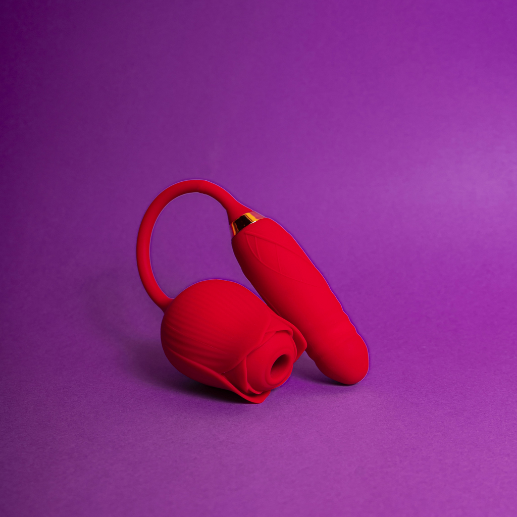 Una romantica rosa rossa succhia-clitoride che porta con sé un vibratore interno, dal design realistico.